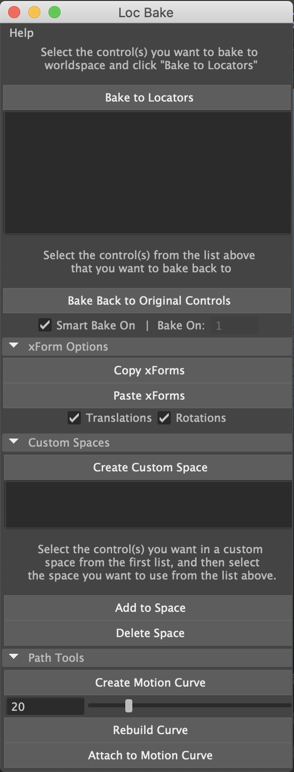 - Select the objects you wish to bake to a locator and choose "Bake to Locators".